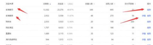 可以看到主要的的流量来源是首页流量和搜索流量,其中首页流量的加购率较低,所以我们后面想要得到更多的首页流量就要通过活动来增加首页的加购率,从而引入更多的首页流量,或者用直通车定向来精准首页的流量也是可以的。搜索流量整体数据反馈还是可以的,证明我们引流方向是没有问题的,但是搜索流量较少所以我们应当增加搜索流量的引入,点击详情就可以查看具体哪些关键词带来的流量,可以让我们去针对这些关键词用直通车引流。