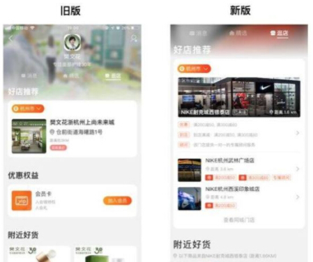 第一,“逛店页”原先只能展示1个品牌门店,改版后最多可展示3个品牌门店。在门店的排序规则上,用户关注的门店将优先展示,其次考虑门店的LBS地理位置。假如用户关注的同城门店大于或等于3个,则会优先展示关注门店,并基于关注门店地理位置的由近到远进行排序。