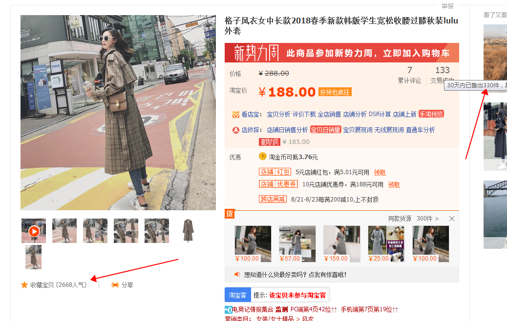 选出来的款式,登记他们的销量,收藏人气。每天观察。建议最好观察3天以上。观察他们每天的销量,每天的收藏人气,这里就可以选出很不错的款式了,最后筛选出来的款式,去测款,筛选出来数据表现最优秀的款。就可以操作你的爆款之旅了。